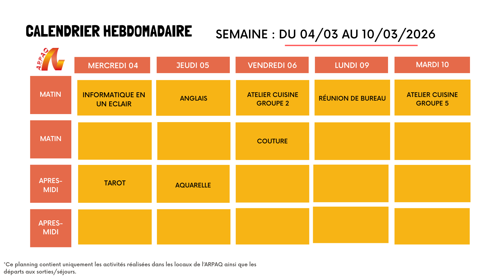 CALENDRIER DU 04 au 10 mars 2026
