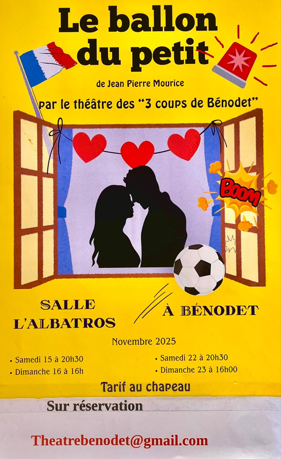 La troupe de théâtre « Les 3 coups de Bénodet » vous invitent à venir passer un agréable moment lors de la représentation de la pièce « Le ballon du petit ». Voici les différentes dates :