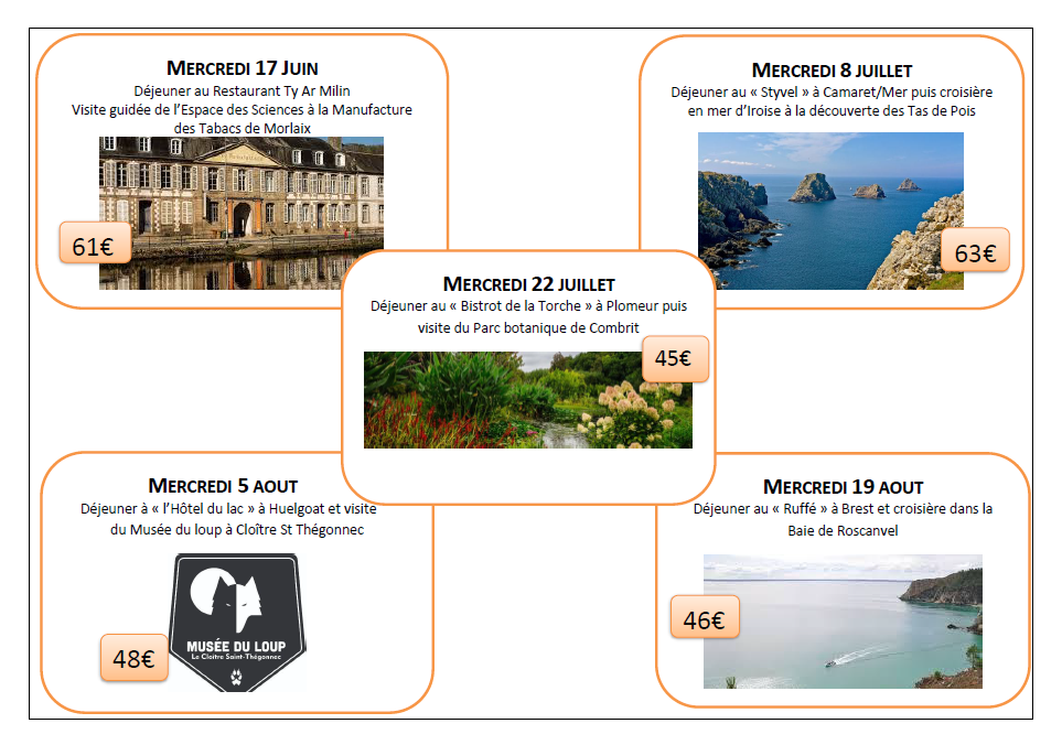 Sorties/balades à la journée entre 9h30 et 18h30, organisées pour les adhérents les plus âgés… Ces sorties s’adressent à un public qui rencontre des difficultés de mobilité et pour lequel les autres sorties ont un rythme trop soutenu. Un circuit avec 10 arrêts est organisé sur tous les quartiers de la ville de Quimper pour l’aller comme le retour. Un professionnel et des bénévoles accompagnent ces sorties.