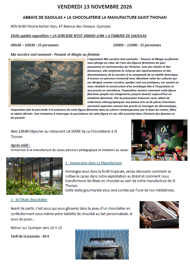 Voici le programme de la nouvelle sortie à thème du mois de Novembre 2026 ! N’hésitez pas à venir vous inscrire dès maintenant !