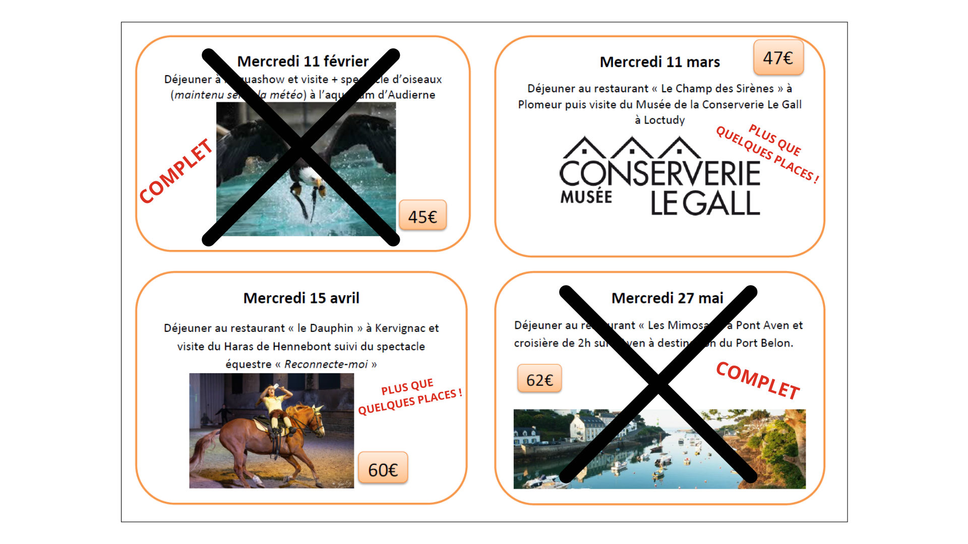 Plus que quelques places pour les vacances à la journée, vous trouverez ci-dessous le programme avec les places disponibles :
