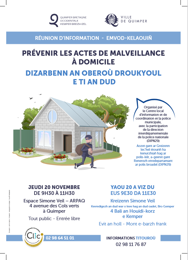 Le Centre local d’information et de coordination (CLIC) de Quimper Bretagne Occidentale et la direction de la tranquillité publique et de la proximité organisent, en partenariat avec la direction interdépartementale de la police nationale – une réunion de sensibilisation pour prévenir les actes de malveillance, jeudi 20 novembre, à 9h30, au sein de l’ARPAQ.
